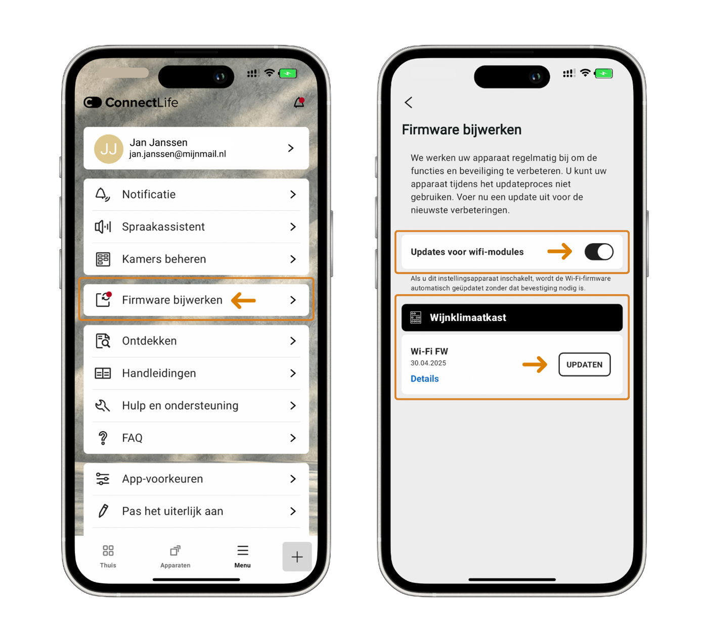 Om optimaal gebruik te kunnen maken van ConnectLife™ is het belangrijk om de app en het apparaat up-to-date te houden. Dit is mogelijk aan de hand van updates. Je vindt hieronder instructies voor het updaten van de app en apparaten.